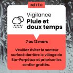 doux temps et pluie prévu du 7 au 12 mars 2026 Veuillez éviter le secteur surfacé derrière le village de Ste-Perpétue et prioriser les sentier grattés. Merci pour votre collaboration.